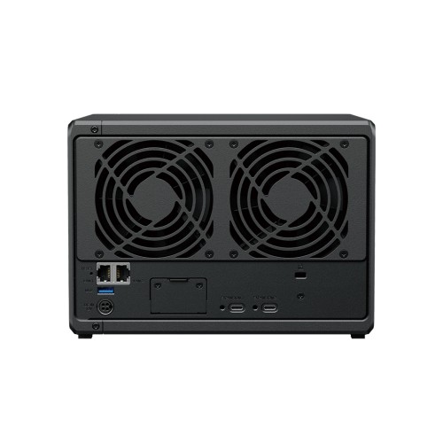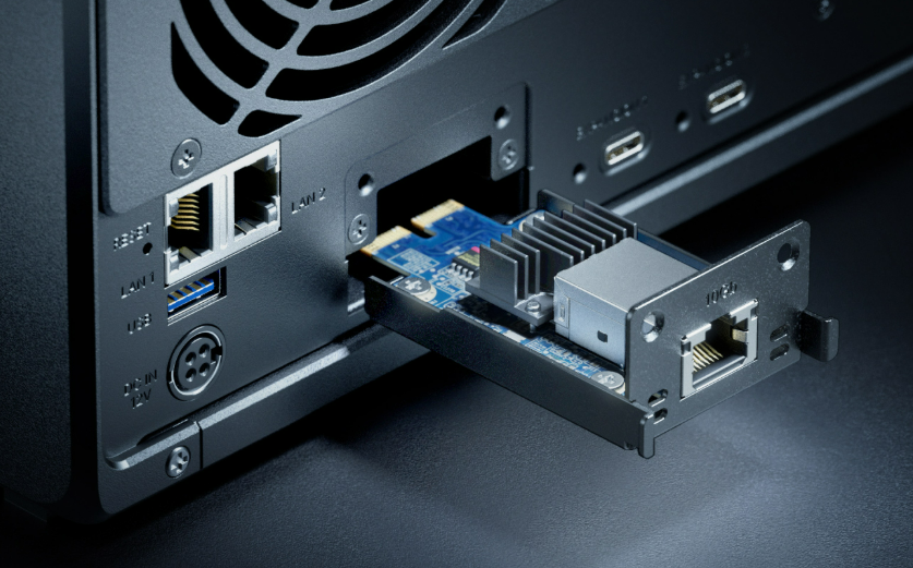 O DS1525+ possui rede 2,5GbE integrada com opção 10GbE4e suporta SSDs e HDDs SATA em baias internas de 2,5"/3,5", bem como unidades M.2 NVMe por meio de slots M.2 para uso como cache.