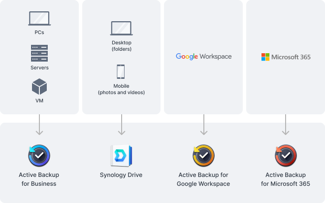 Proteja todos os dados, aplicativos e configurações em seus sistemas Synology com backups agendados abrangentes, incluindo backups bare-metal, em servidores locais e remotos, unidades externas ou destinos de armazenamento em nuvem, incluindo o Synology C2 Storage .