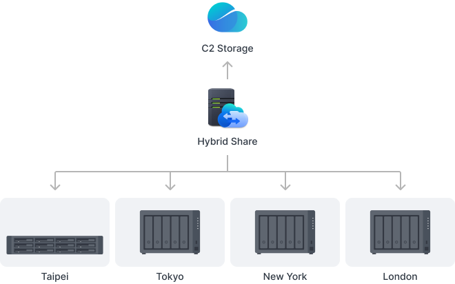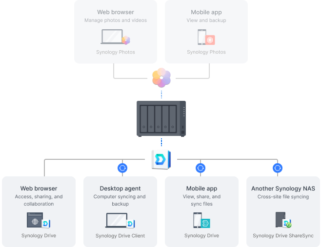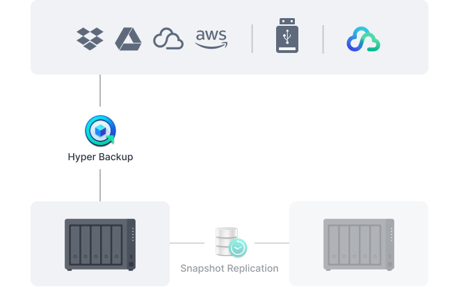 Mantenha os dados sincronizados automaticamente entre o Synology NAS e os principais provedores de nuvem, incluindo BackBlaze B2, Dropbox, Google Drive e Microsoft OneDrive. Suporte a vários protocolos, criptografia do lado do cliente e controles personalizáveis de sincronização e largura de banda permitem um gerenciamento de armazenamento eficiente em diversas plataformas.