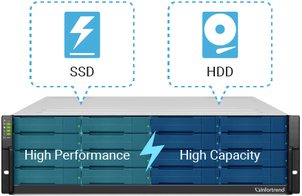 - O armazenamento em camadas automático (Auto-tiering) permite que você use SSD U.2 NVMe no GS e HDD NL-SAS/SATA em gabinetes de expansão para aproveitar o alto desempenho do SSD e a grande capacidade do HDD.