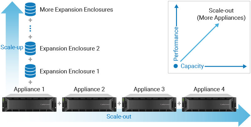Na arquitetura de escalonamento horizontal, o GS pode aumentar linearmente o desempenho e a capacidade para ambientes em nível de bloco e de arquivo. Quando uma unidade GS não for mais capaz de fornecer desempenho ou capacidade suficientes, você pode simplesmente adicionar mais dispositivos GS para formar um cluster — com um máximo de 4 unidades GS. O GS também suporta expansão em escala vertical com gabinetes de expansão para adicionar até 896 unidades e aumentar a capacidade de armazenamento.