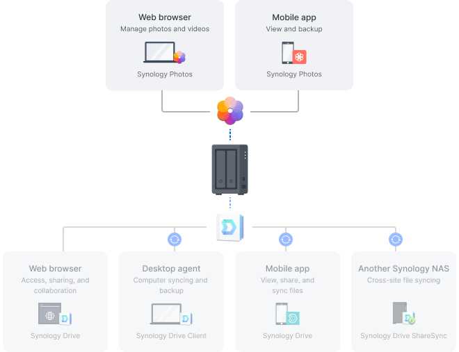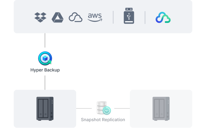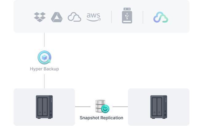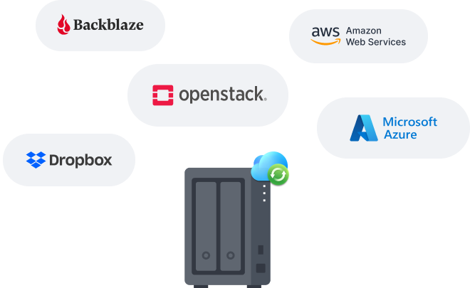Mantenha os dados sincronizados automaticamente entre o Synology NAS e os principais provedores de nuvem, incluindo BackBlaze B2, Dropbox, Google Drive e Microsoft OneDrive. Suporte a vários protocolos, criptografia do lado do cliente e controles personalizáveis de sincronização e largura de banda permitem um gerenciamento de armazenamento eficiente em diversas plataformas.